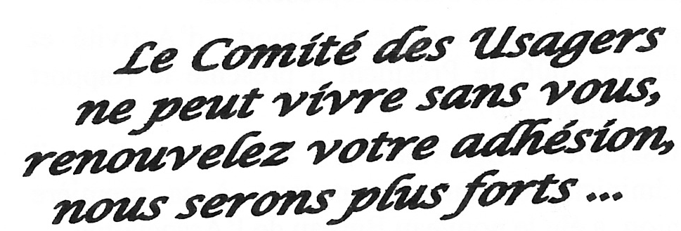 Il est absolument nécessaire que plus d'adhérents se mobilisent pour nous rejoindre s'ils veulent garder leur Comité des Usagers et son journal.